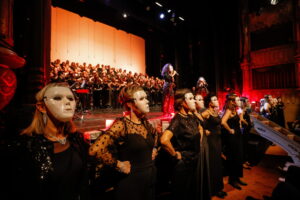Un unico enorme coro che sorprende per l’effetto imponente della quantità di voci e coinvolge il pubblico per la scelta di un repertorio assolutamente originale e imprevedibile che interpreta con grande impatto scenico ed emotivo.