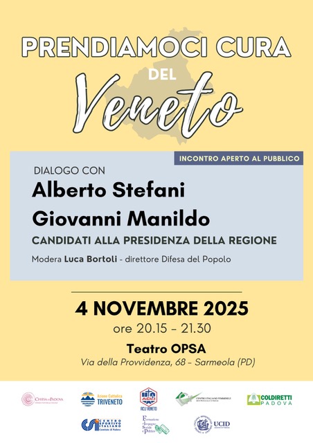 L’incontro, dal titolo “Prendiamoci cura del Veneto”, si terrà martedì 4 novembre 2025, dalle 20.15 alle 21.30, nel teatro dell’Opera della Provvidenza S. Antonio di Sarmeola di Rubano (Pd). Modera l’incontro Luca Bortoli, direttore del settimanale diocesano La Difesa del popolo.